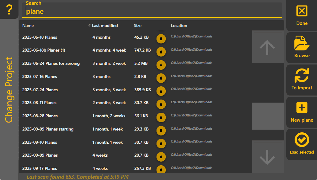 To change the loaded project, tap the Change Project button on the Apply View or in the More menu. Tapping it will show a full page (see below), listing all projects that can be found on your computer. To load a specific project, tap it, then choose Load selected on the bottom right (double-tapping a project also works). To filter the projects to a specific one, tap the search field at the top and type in a search term.