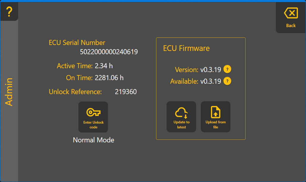 In the COMMAND Admin page you can enter your COMMAND unlock code and update firmware if required. You can also see how many hours the COMMAND controller has been running and actively controlling. Firmware updates are infrequent, but you'll be prompted to update if required.