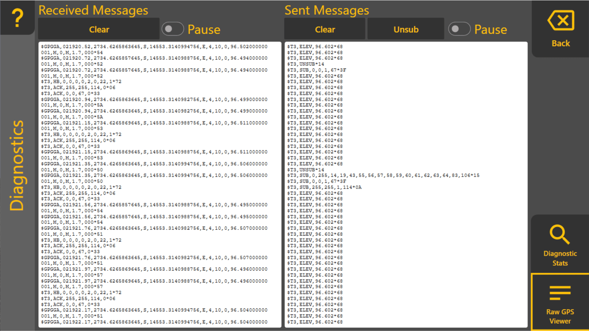 Once you're in the Diagnostics page, there are two tabs - Diagnostic Stats and Raw GPS Viewer. Select the one you're interested in using the buttons in the bottom right of the page.