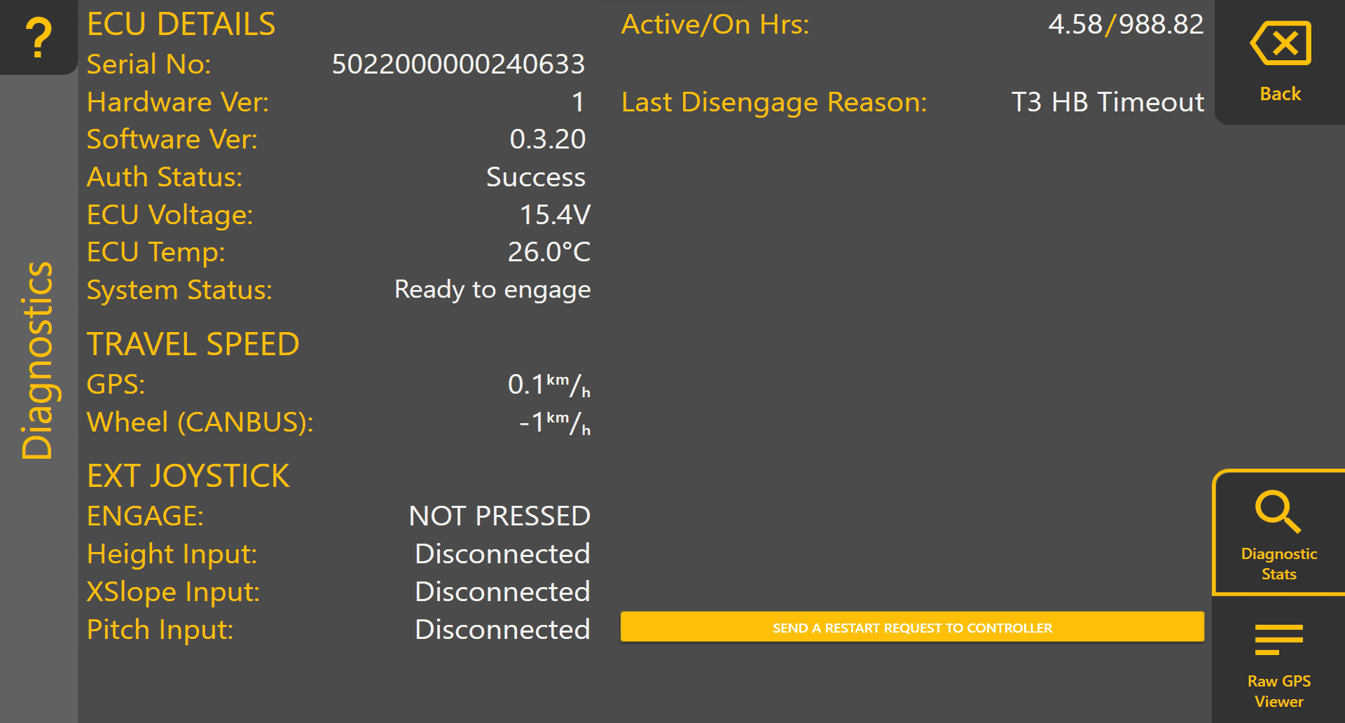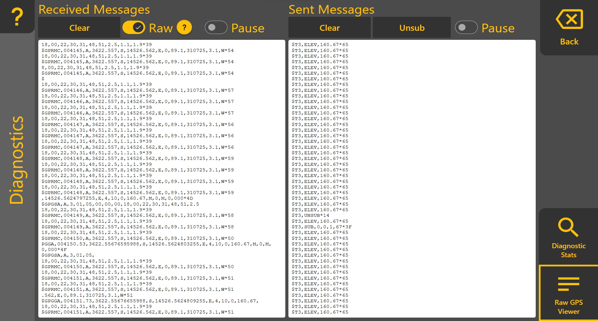 Once you're in the Diagnostics page, there are two tabs - Diagnostic Stats and Raw GPS Viewer. Select the one you're interested in using the buttons in the bottom right of the page.