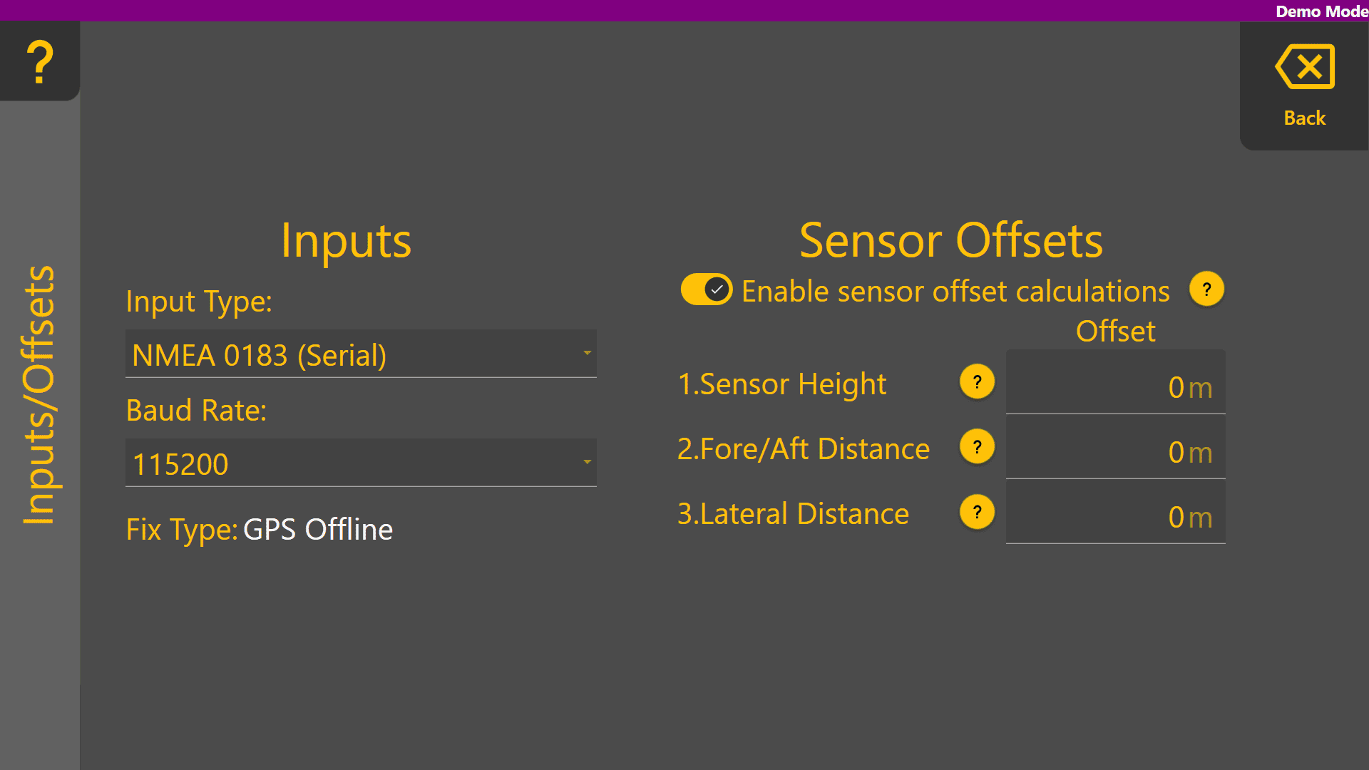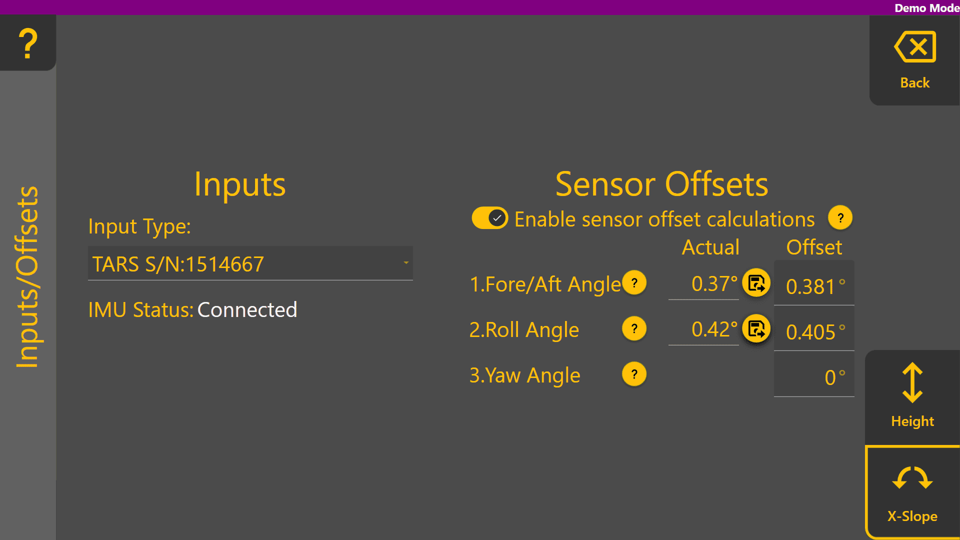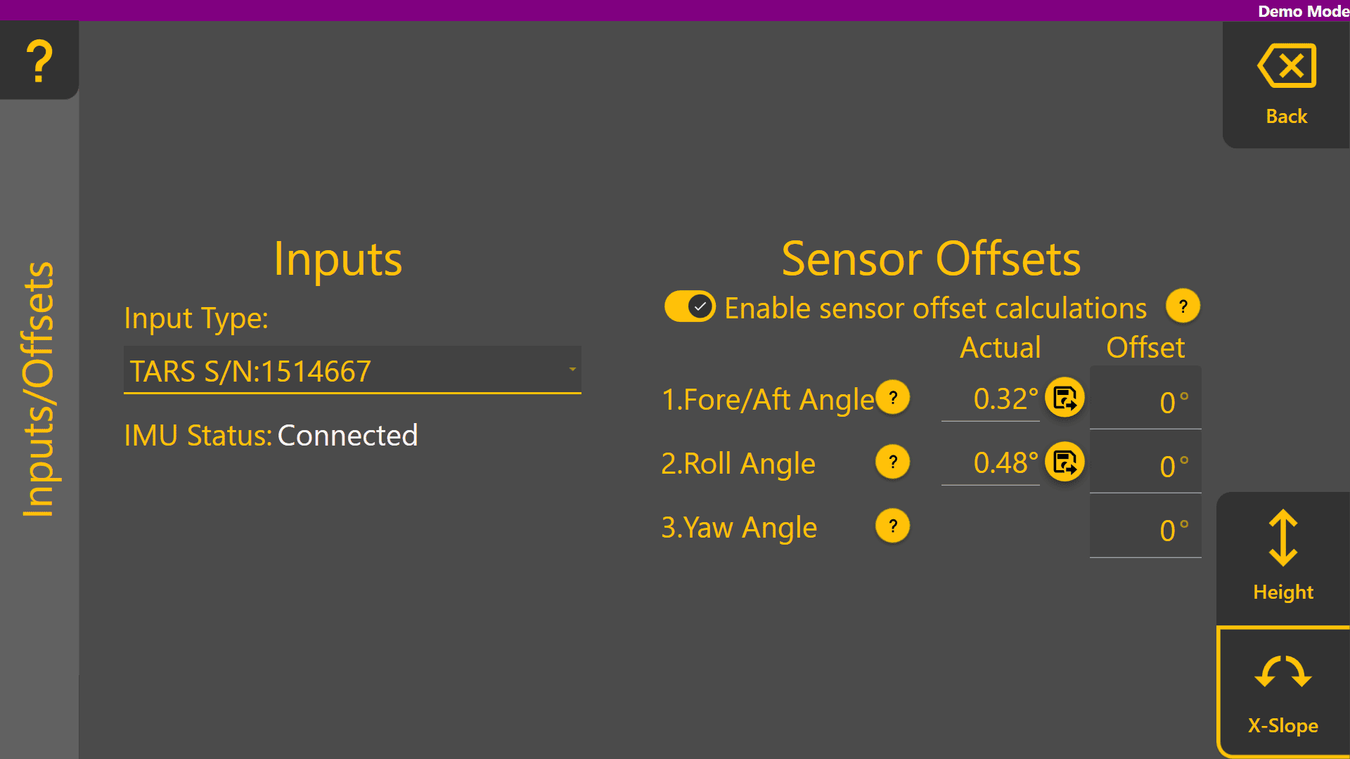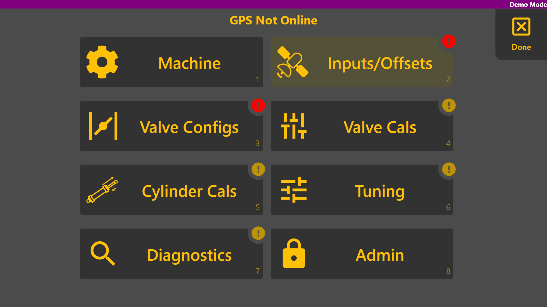 The Inputs / Offsets page is used for selection of input sensors, such as GNSS receivers for height control or Inertial Measurement Units (IMU) for terrain compensation and Tilt / X-slope control.
