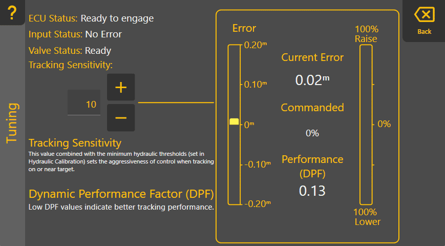 The Tuning page allows you to finess the tracking sensitivity of each function (height, cross slope). Adjust the sensitivity to ensure smooth tracking of the commanded height. On the right, the current error and commanded output strength are displayed as bars. A 'Dynamic Performance Factor' number is shown on the right too - smaller is better.
