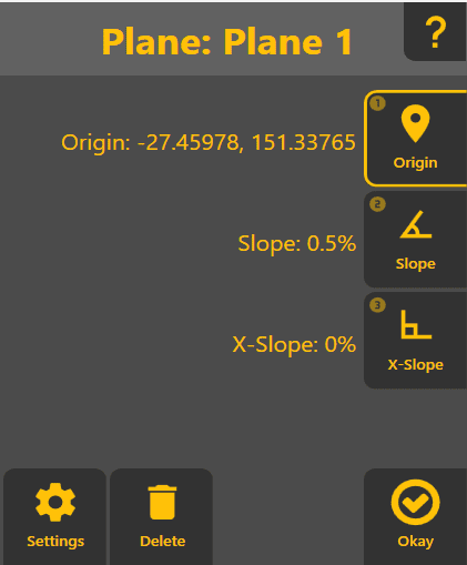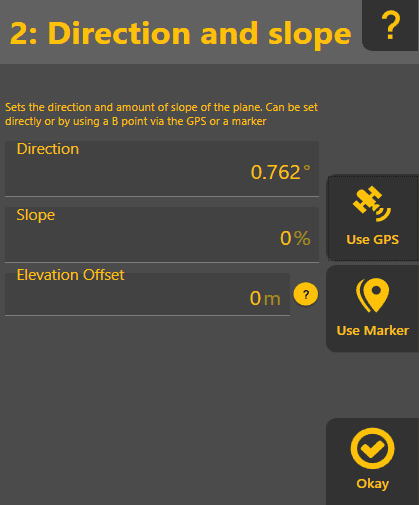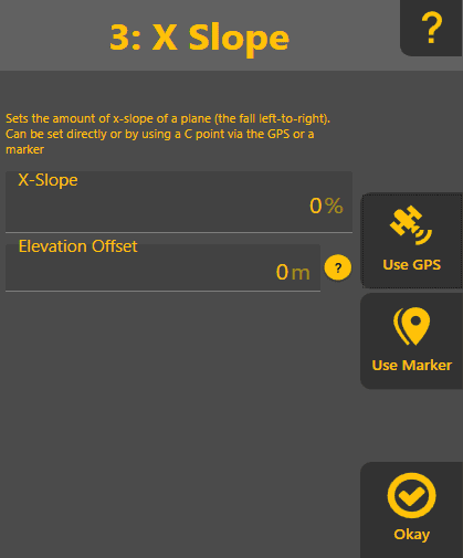 Elevation Offset: Only shown after using GPS or a marker. Allows the changing of the slope by a fixed elevation. Ie if you know you need to cut 10cm at the current location, enter 10cm here and it will calculate the appropriate slope.