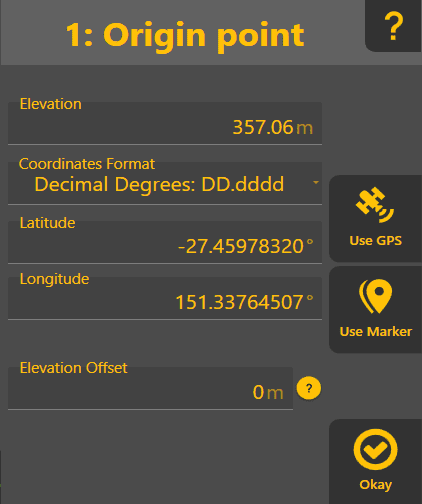 Elevation/Latitude/Longitude: Defines the position of the origin. Can be set via GPS or a marker by clicking on "Use GPS" or "Use Marker". The "Coordinates Format" will allow one to specify the latitude/longitude in various formats - ie it's only a visual change.