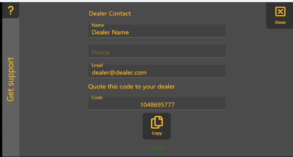 'Get support' - helps you receive remote support from your dealer. You must be connected to the internet for this to work.