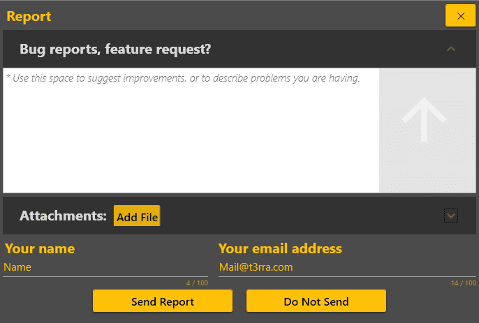 'Report' - opens up a bug report/feature request window allowing you to report issues to T3RRA. The name and email address fields of this window are automatically filled using the details linked to the licence page. You must be connected to the internet for this to work.