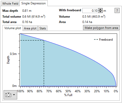 • 'Area' This is the area of the depression at the chosen freeboard level. As freeboard increases, this will decrease.